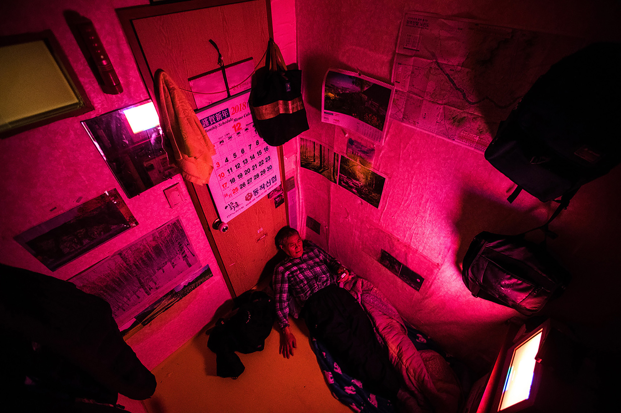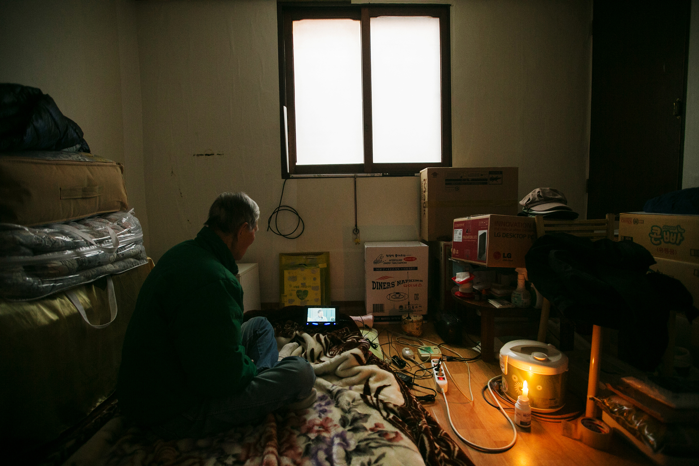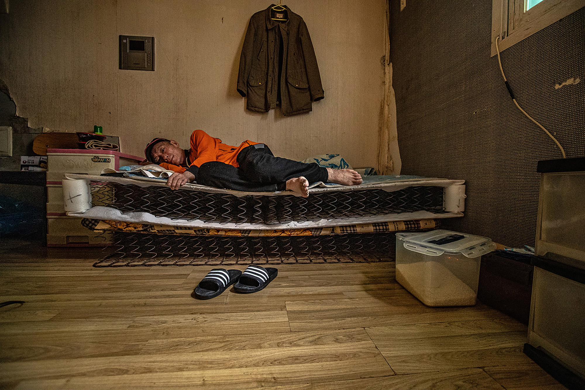 Beyond the shantytown of Guryong Village, located in the most expensive area of Gangnam, Seoul, the luxury apartment complex Tower Palace can be seen.Mr. Choi Se-sik is watching TV in his Goshiwon room. Goshiwon is a type of temporary housing facility that is not officially recognized as a residential space. The rooms are extremely small, and the walls are so thin that sounds from adjacent rooms can be clearly heard.Kim, who lives in Goshiwon Village in Daehak-dong, Seoul, has a corner of his room occupied by a spring mattress he found on the street, providing him with comfort.Mr. Park, who has become isolated after failing the judicial examination, lives in a room in a Gosiwon (exam preparation boarding house) in Daehak-dong, Gwanak District, Seoul. He leads a life cut off from family and friends. His room is cluttered with unpacked boxes and unthrown garbage.A middle-aged resident of the jjokbangchon lights a cigarette in his room.A man who once engaged in peace activism now confines himself in a small room within a goshiwon, cutting off communication with the outside world. His room is filled with unknown records, connecting him to his own personal channels of communication.A nameless tombstone for someone who died alone, unclaimed by anyone. This is the burial site for those who died in Korea without any known relatives.A ‘Goshiwon’ in Yeongdeungpo, where someone quietly met their end alone, their death only discovered due to the foul odor. A goshiwon is a type of residence, but it is so small that an adult can barely stretch their legs. Most have shared bathrooms. The term "goshiwon" combines "goshi," which refers to national exams, and "won," meaning facility. Initially, these spaces were primarily inhabited by people preparing for national exams. However, nowadays, goshiwons have become a symbol of poverty, as they offer cheap accommodation without a deposit.he alleyway of a building filled with over a dozen single-room units is just wide enough for one adult to pass. The building manager’s pet dog makes its way through the narrow path.A room in a jjokbang village, occupied by an elderly man, is plastered with pornographic photos. These jjokbang, often less than a single pyeong in size, are located in neighborhoods perceived as gathering places for the impoverished and the failed.Ham Hak-jun, who lived a life estranged from family, applied to the district office for arrangements following his death. Preparing for his passing, he kept several framed memorial photos provided through volunteer services on the wall above his bed.Mr. Kim, who passed away alone, had his face photographed for administrative records in case any family might come searching. Without a formal funeral, he was taken directly to the crematory.A dim light filtered through the window beside the shared cooking area in the jjokbang. Without personal cooking facilities, residents rely on communal spaces that are often under-equipped.