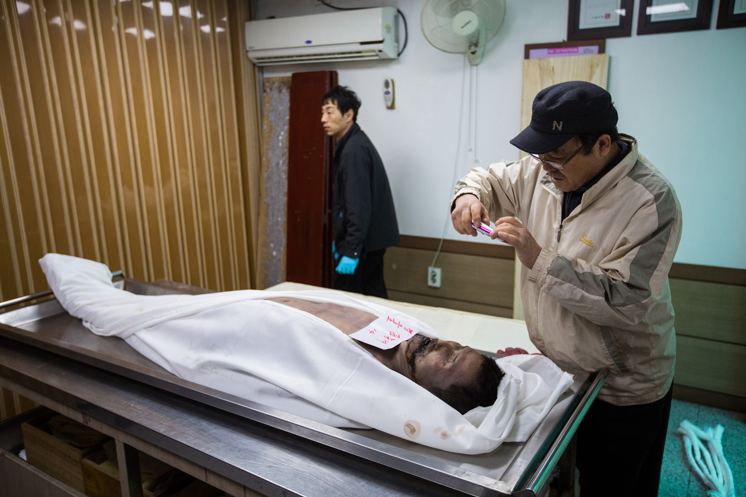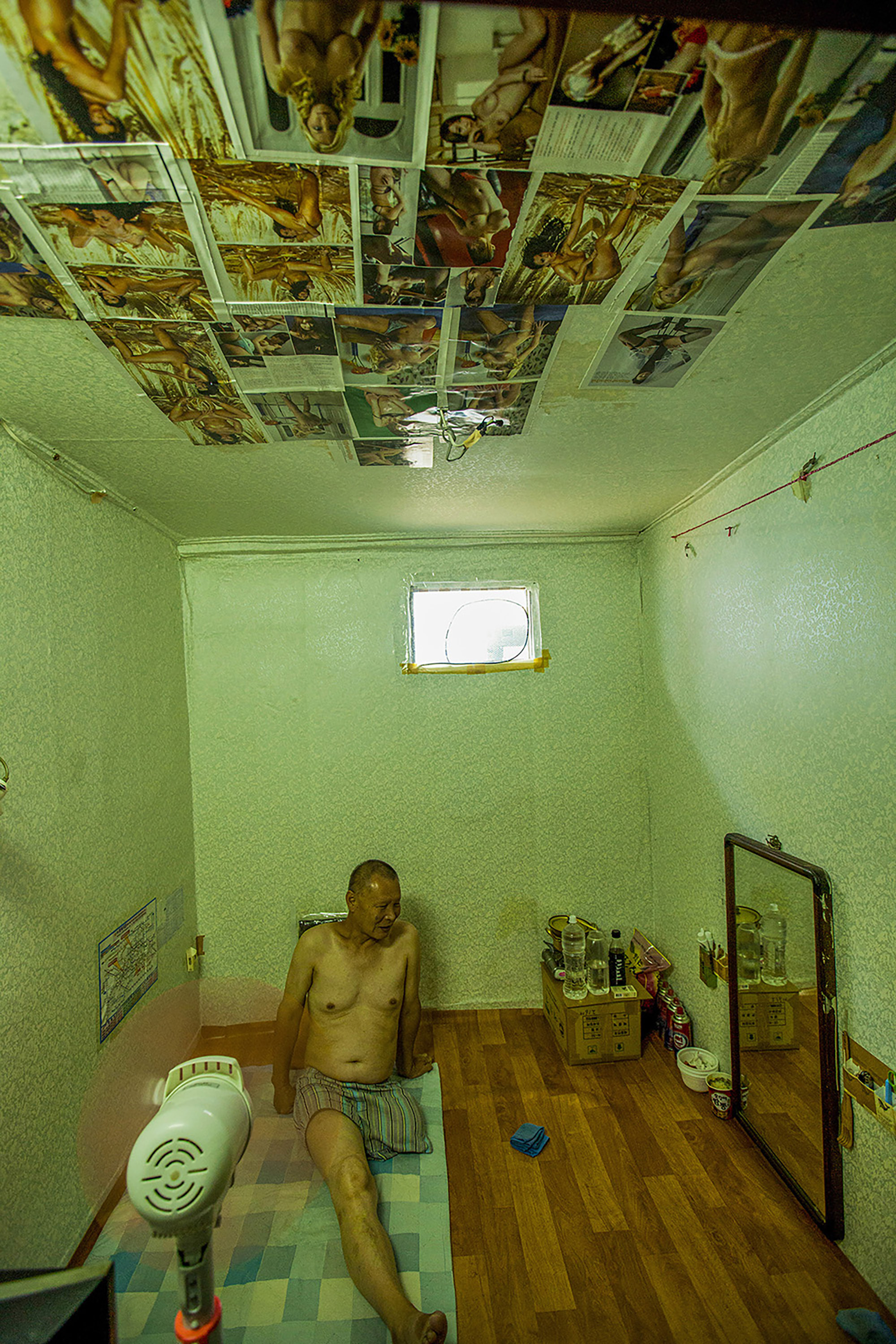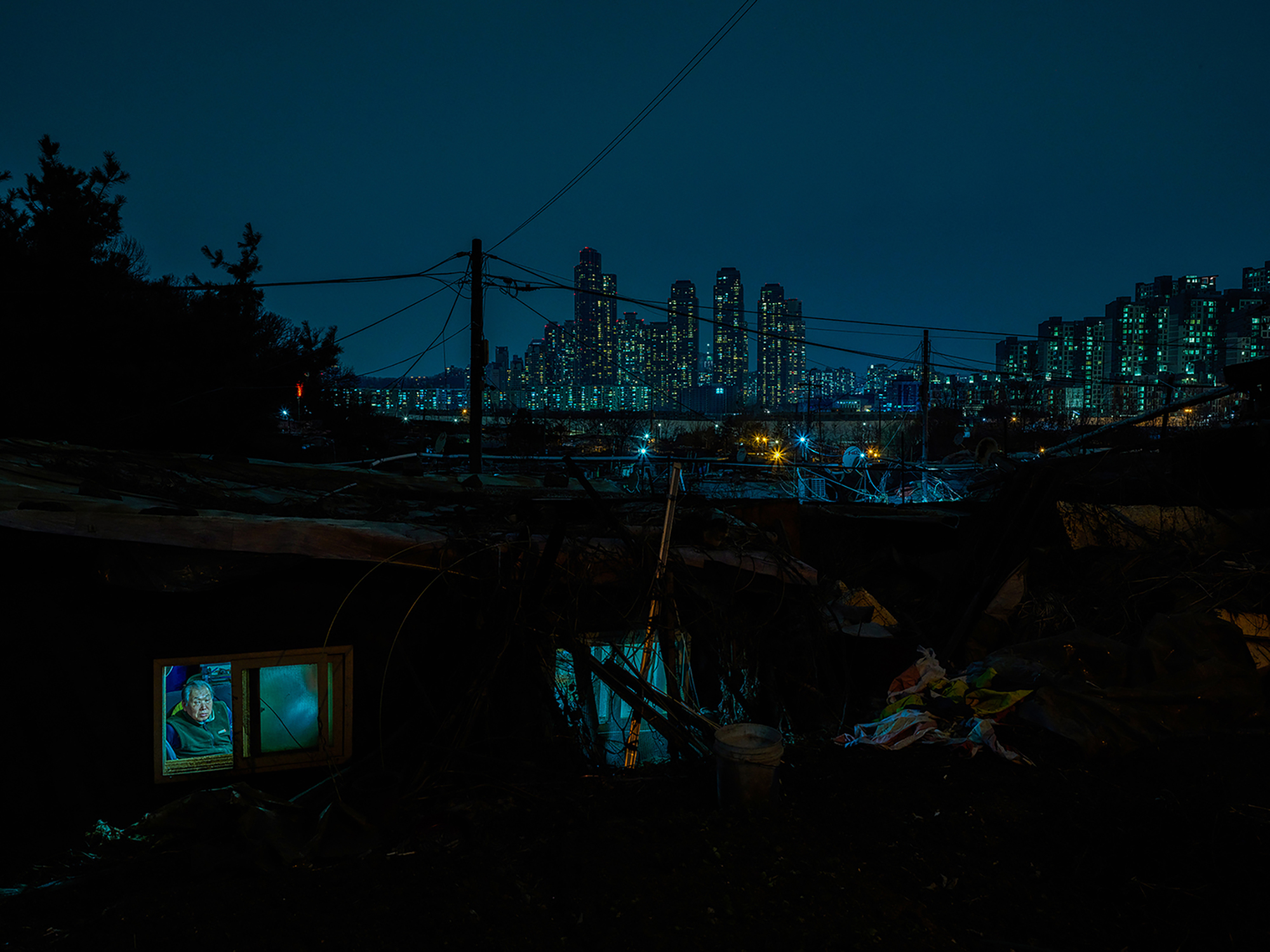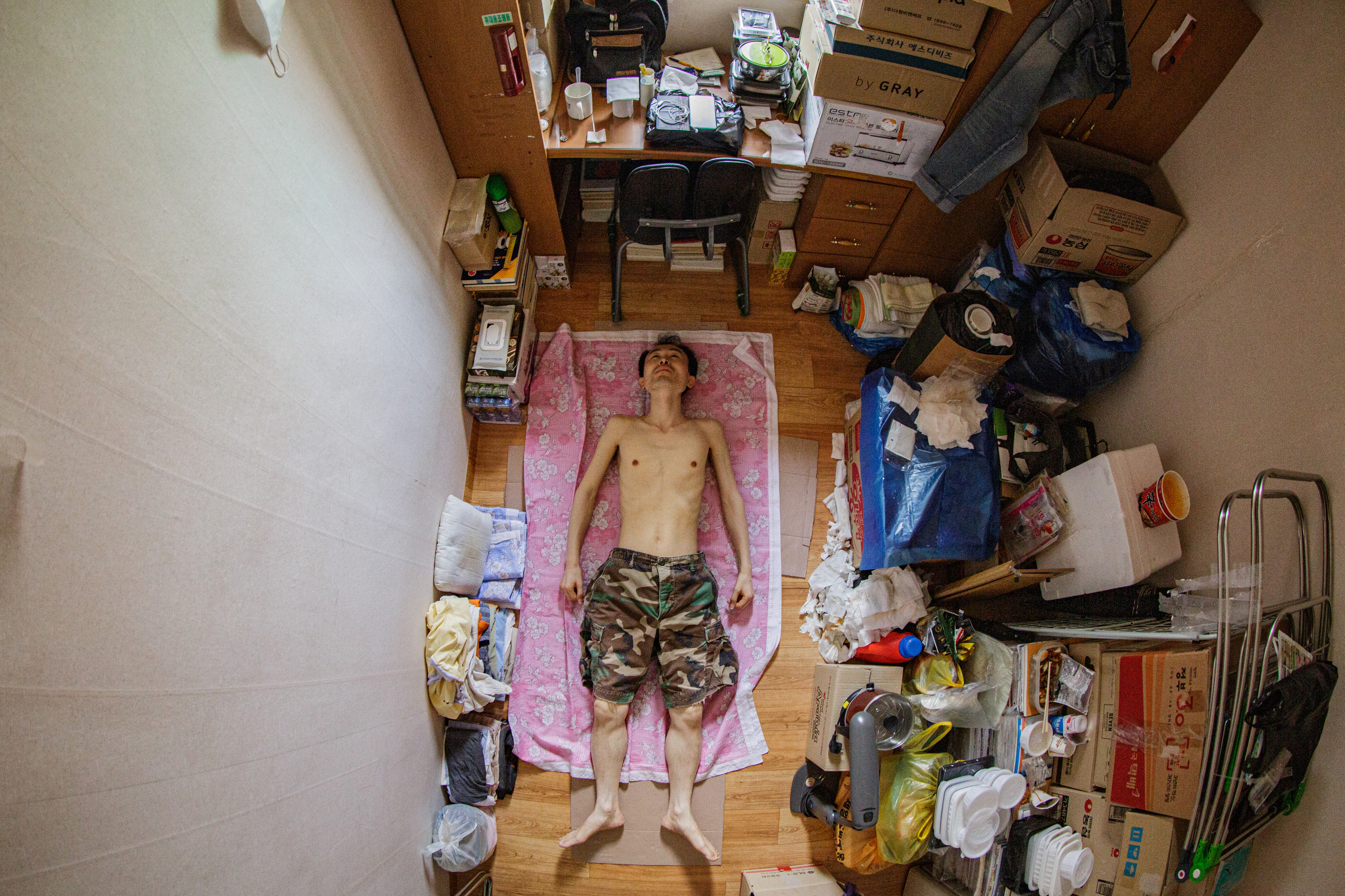 Beyond the shantytown of Guryong Village, located in the most expensive area of Gangnam, Seoul, the luxury apartment complex Tower Palace can be seen.Mr. Choi Se-sik is watching TV in his Goshiwon room. Goshiwon is a type of temporary housing facility that is not officially recognized as a residential space. The rooms are extremely small, and the walls are so thin that sounds from adjacent rooms can be clearly heard.Kim, who lives in Goshiwon Village in Daehak-dong, Seoul, has a corner of his room occupied by a spring mattress he found on the street, providing him with comfort.Mr. Park, who has become isolated after failing the judicial examination, lives in a room in a Gosiwon (exam preparation boarding house) in Daehak-dong, Gwanak District, Seoul. He leads a life cut off from family and friends. His room is cluttered with unpacked boxes and unthrown garbage.A middle-aged resident of the jjokbangchon lights a cigarette in his room.A man who once engaged in peace activism now confines himself in a small room within a goshiwon, cutting off communication with the outside world. His room is filled with unknown records, connecting him to his own personal channels of communication.A nameless tombstone for someone who died alone, unclaimed by anyone. This is the burial site for those who died in Korea without any known relatives.A ‘Goshiwon’ in Yeongdeungpo, where someone quietly met their end alone, their death only discovered due to the foul odor. A goshiwon is a type of residence, but it is so small that an adult can barely stretch their legs. Most have shared bathrooms. The term "goshiwon" combines "goshi," which refers to national exams, and "won," meaning facility. Initially, these spaces were primarily inhabited by people preparing for national exams. However, nowadays, goshiwons have become a symbol of poverty, as they offer cheap accommodation without a deposit.he alleyway of a building filled with over a dozen single-room units is just wide enough for one adult to pass. The building manager’s pet dog makes its way through the narrow path.A room in a jjokbang village, occupied by an elderly man, is plastered with pornographic photos. These jjokbang, often less than a single pyeong in size, are located in neighborhoods perceived as gathering places for the impoverished and the failed.Ham Hak-jun, who lived a life estranged from family, applied to the district office for arrangements following his death. Preparing for his passing, he kept several framed memorial photos provided through volunteer services on the wall above his bed.Mr. Kim, who passed away alone, had his face photographed for administrative records in case any family might come searching. Without a formal funeral, he was taken directly to the crematory.A dim light filtered through the window beside the shared cooking area in the jjokbang. Without personal cooking facilities, residents rely on communal spaces that are often under-equipped.