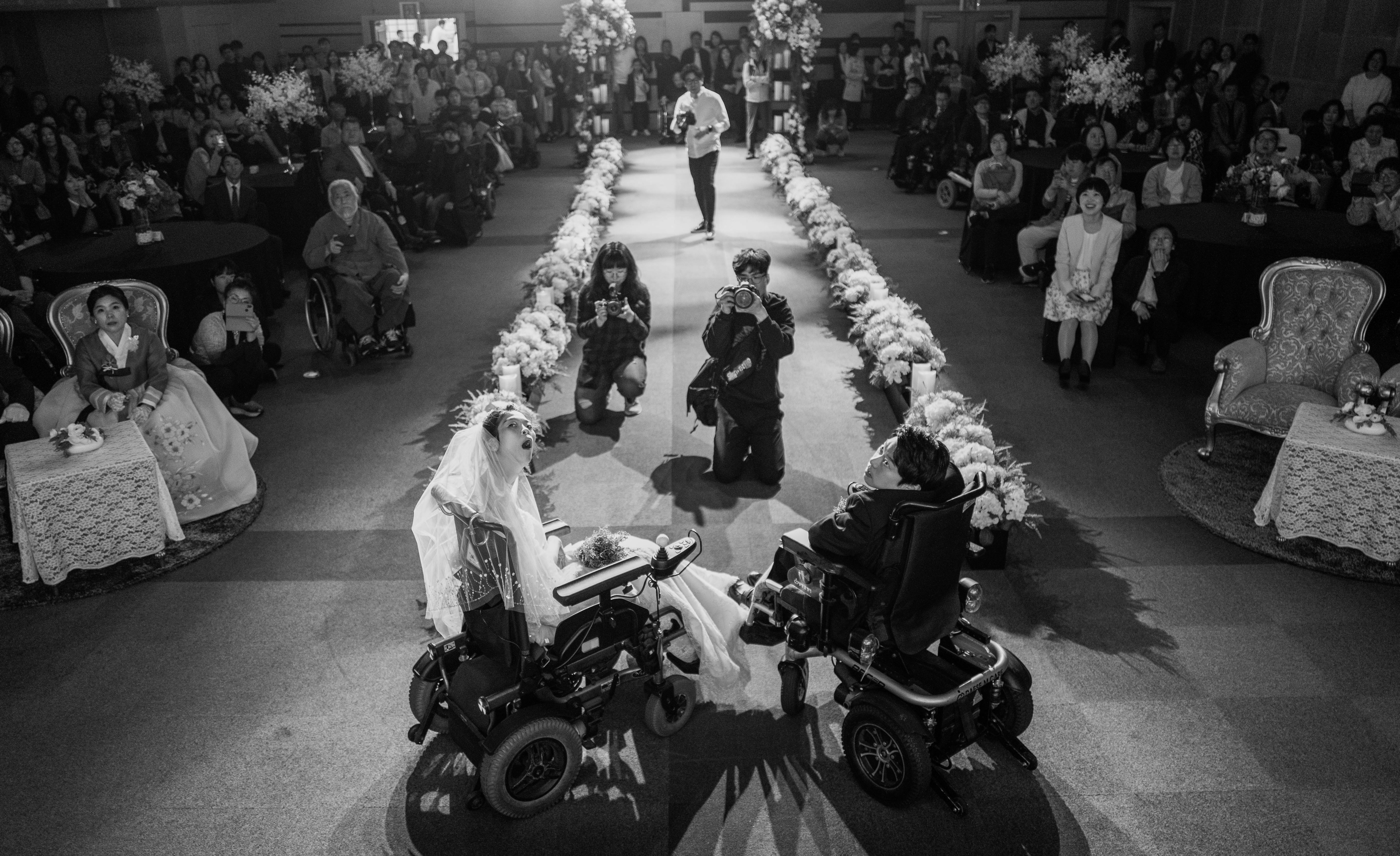Sang-woo always spends his time lying down at home. Young-eun can barely stand up unless there is a wall or an object to support her. They provide strength to each other. A recently hung wedding photo is displayed on the wall.It is not easy to walk side by side in electric wheelchairs. In public places, we cannot walk side by side and always have to follow behind.When they are alone together, they express their love for each other.They had a magnificent wedding ceremony. The wedding was held amidst the blessings of disability organizations and many others.Youngeun left a message on the chat program designed for individuals with severe disabilities: “I had briefly visited the facility, but since there were specific visiting hours, I could only see them for a short time. I was worried that if I started dating, I might be taken to the director’s office and scolded, so I kept my feelings to myself. Now that I am back at the facility, I have re-enrolled. As for pregnancy, I haven’t made any plans yet. I would like to have a child, but given my disability, we have mutually agreed not to pursue that for now.”Youngeun lightly touches Sangwoo’s cheek and smiles, prompting Sangwoo to poke Youngeun’s cheek in return. This is one way they express their affection for each other.Sangwoo and Youngeun attached a golf ball to the controller of the electric wheelchair for easier maneuverability. The two of them have become a couple item that their colleagues envy