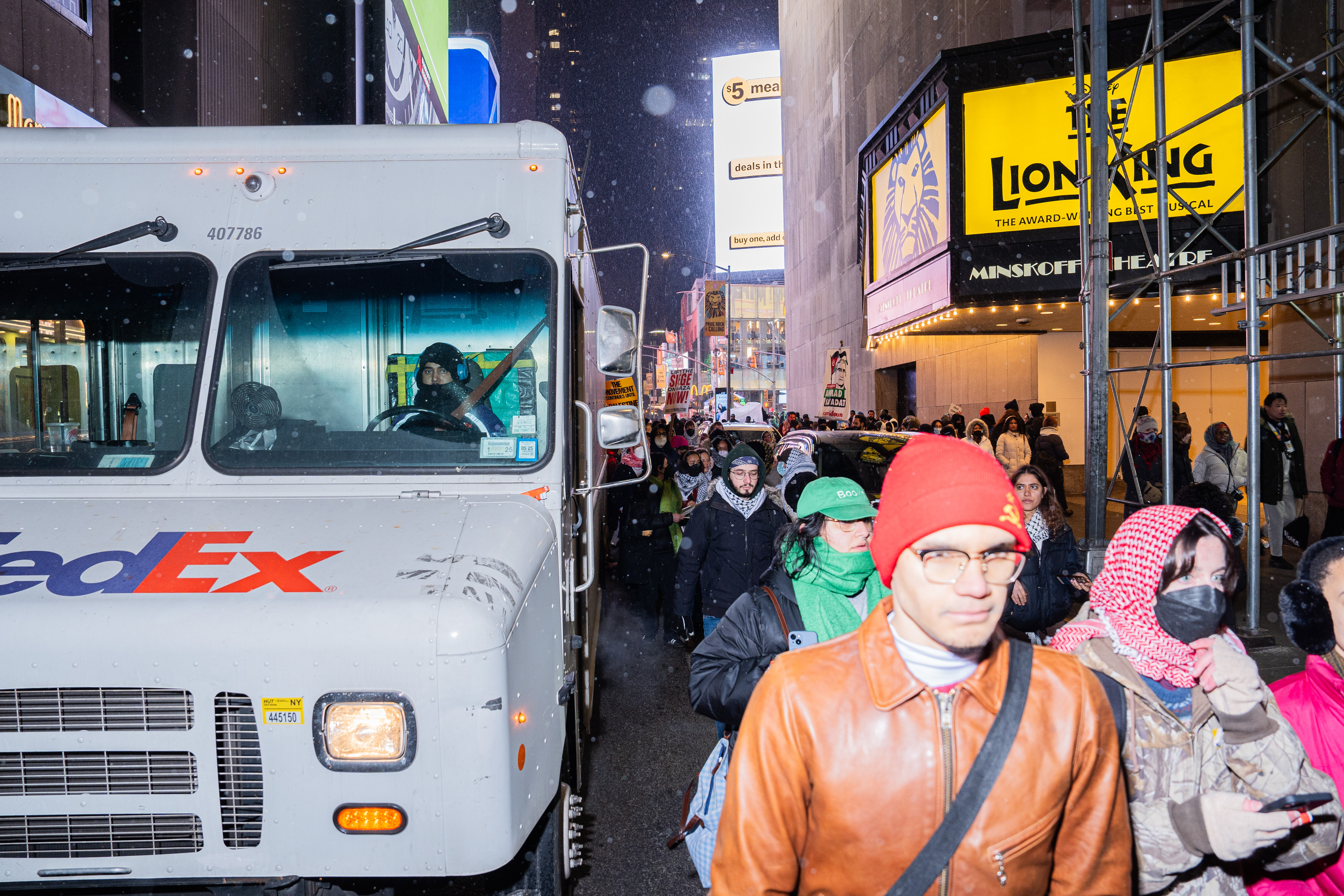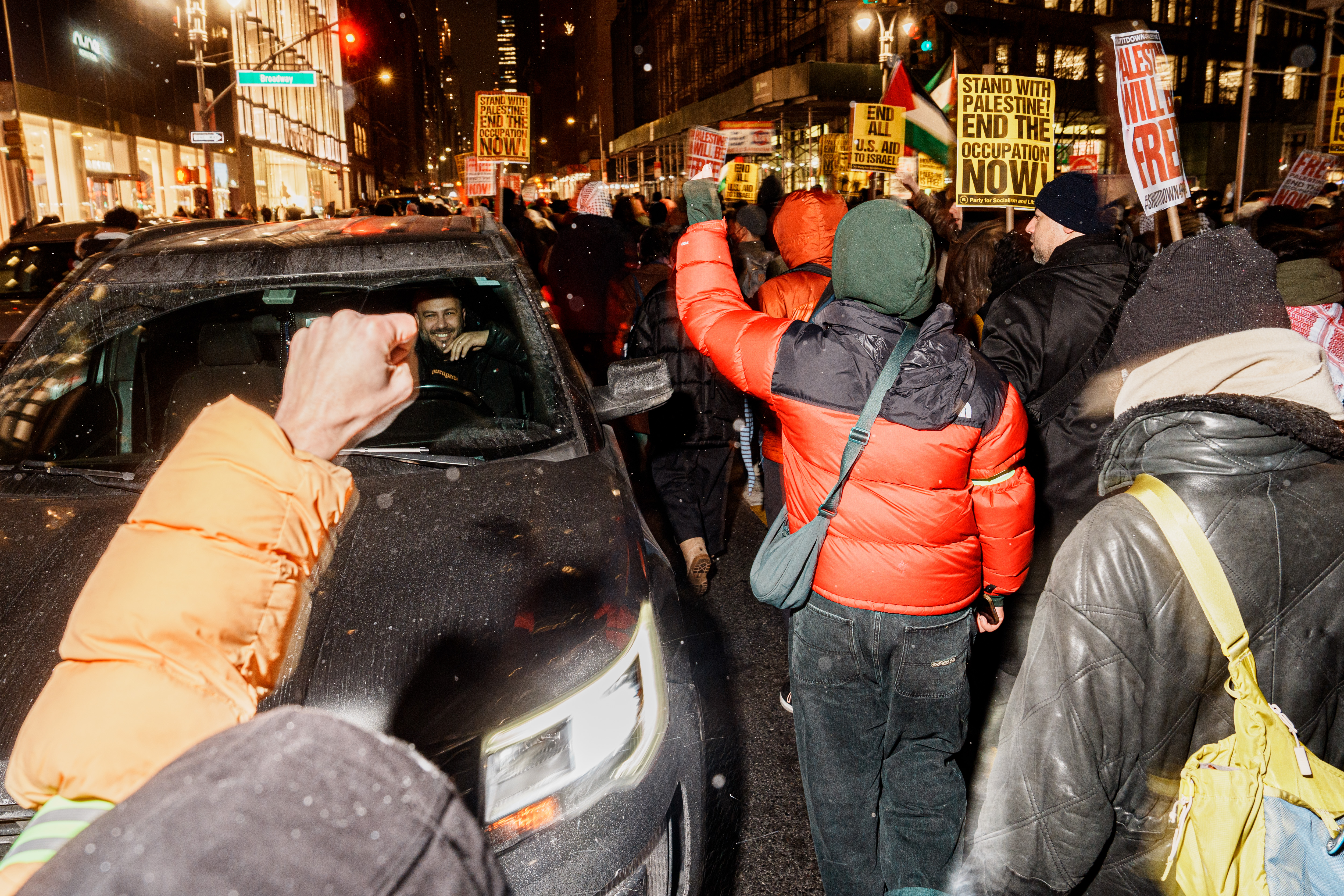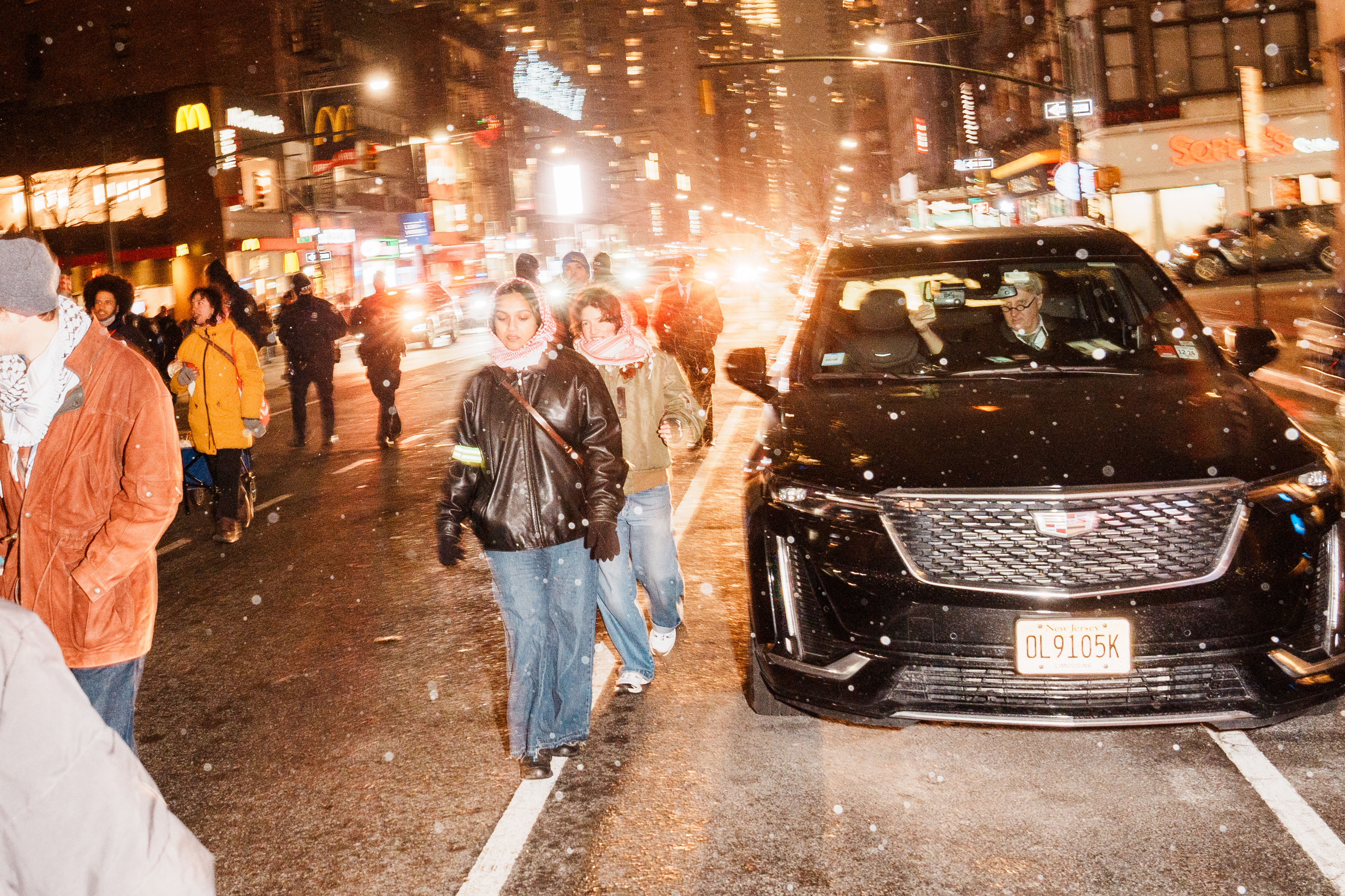 Israel and the Palestinian militant group Hamas agreed to a ceasefire in the Gaza Strip, aiming to halt hostilities and facilitate the release of hostages. In response to this development, a rally and march were held on January 16 at Times Square (West 43rd Street & Broadway) in New York City, organized by Palestinian support groups. Attendees gathered under the slogan “Ceasefire Today, Liberation Tomorrow: Gaza Will Rise,” expressing support for the ceasefire agreement and calling for the liberation of Palestine. Drivers passing by were captured with a range of expressions as they watched the demonstration unfold from their vehicles.