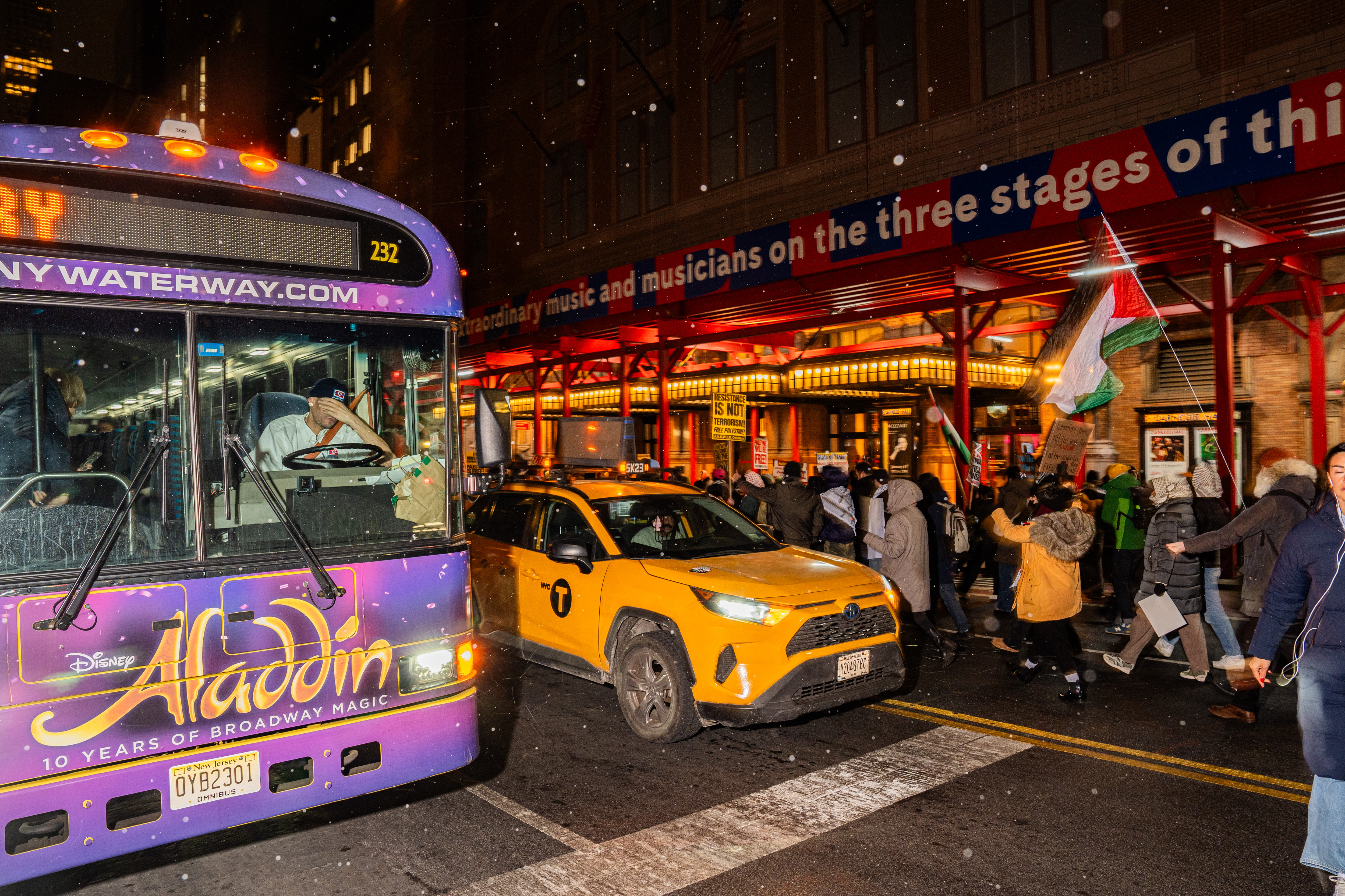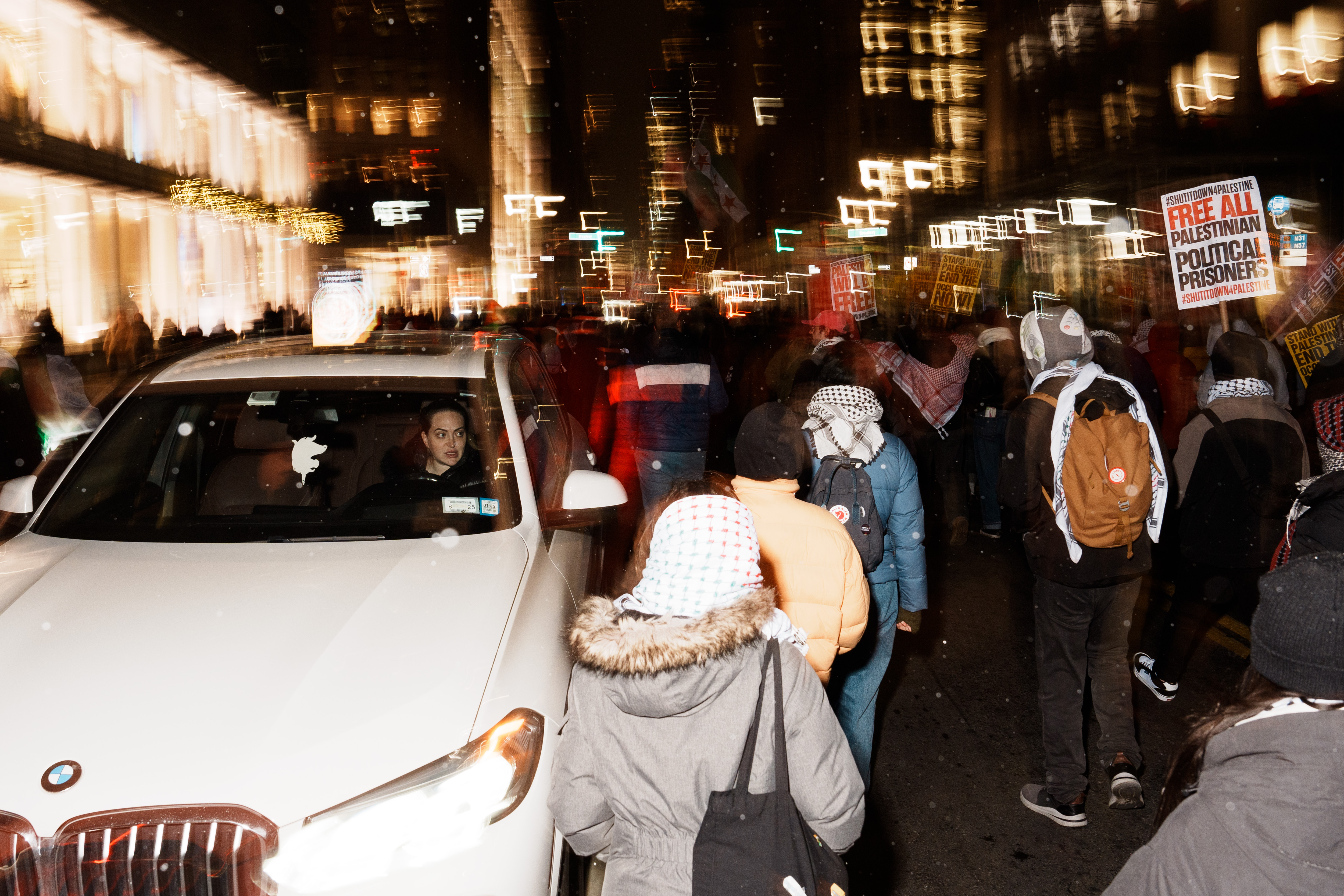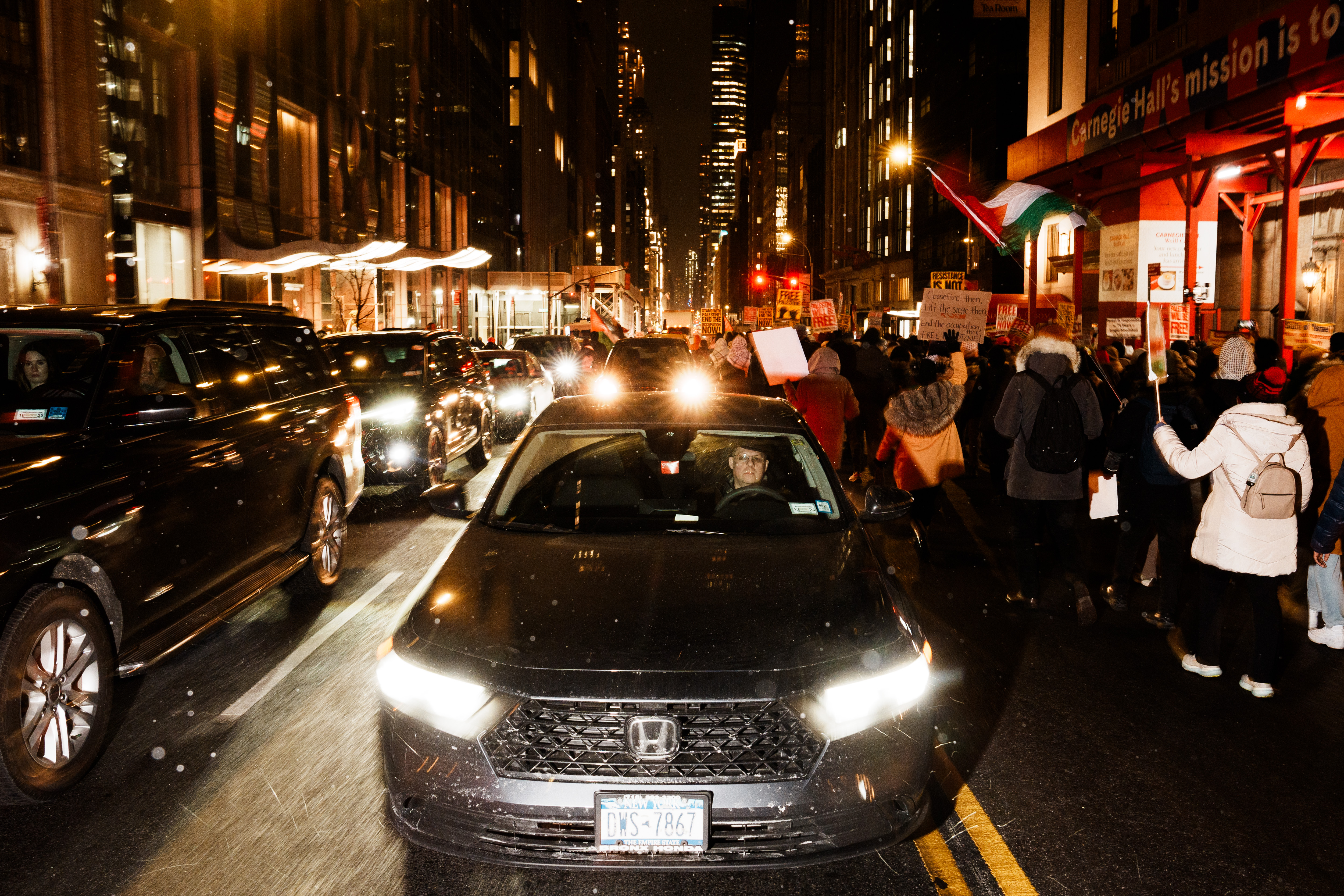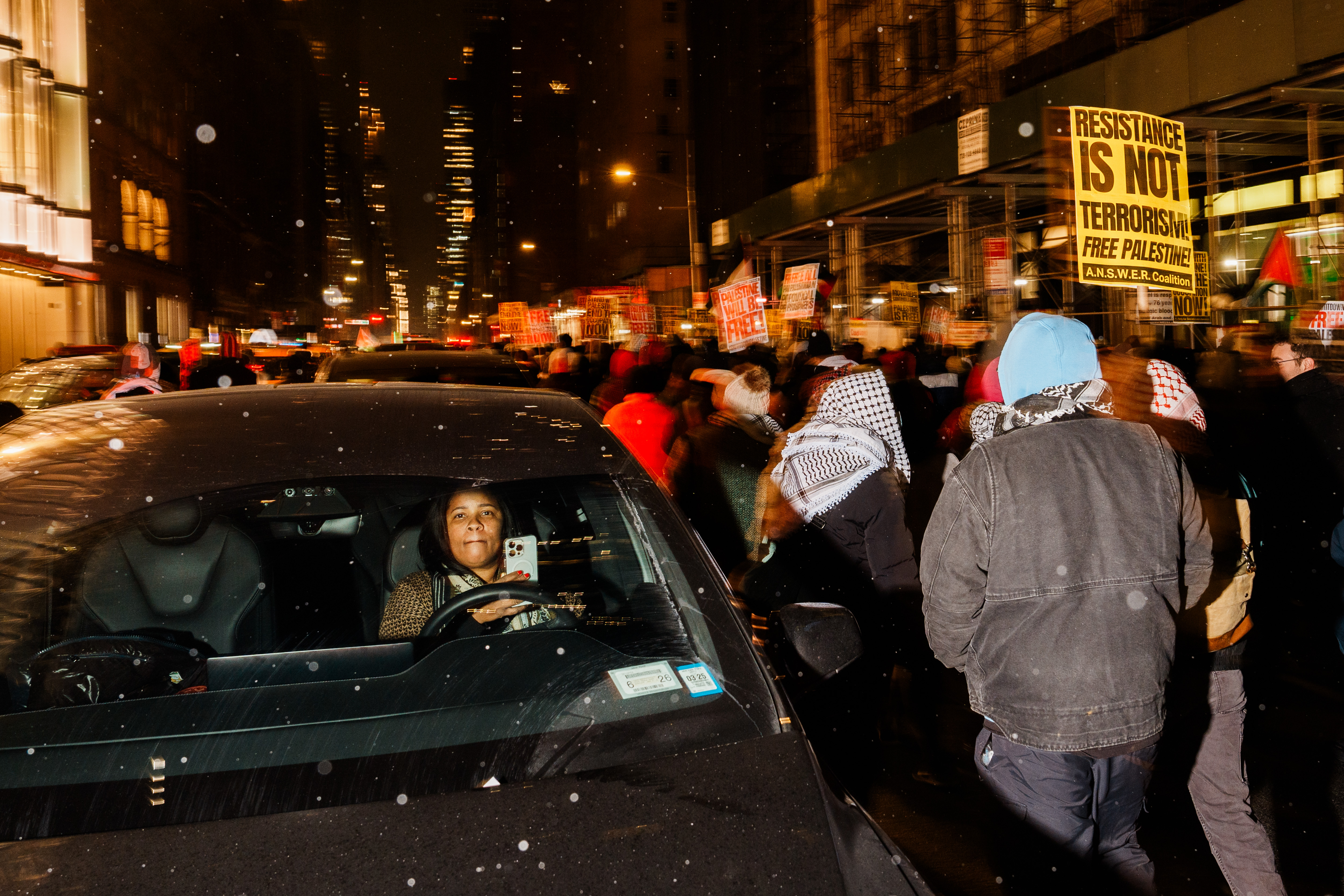 Israel and the Palestinian militant group Hamas agreed to a ceasefire in the Gaza Strip, aiming to halt hostilities and facilitate the release of hostages. In response to this development, a rally and march were held on January 16 at Times Square (West 43rd Street & Broadway) in New York City, organized by Palestinian support groups. Attendees gathered under the slogan “Ceasefire Today, Liberation Tomorrow: Gaza Will Rise,” expressing support for the ceasefire agreement and calling for the liberation of Palestine. Drivers passing by were captured with a range of expressions as they watched the demonstration unfold from their vehicles.