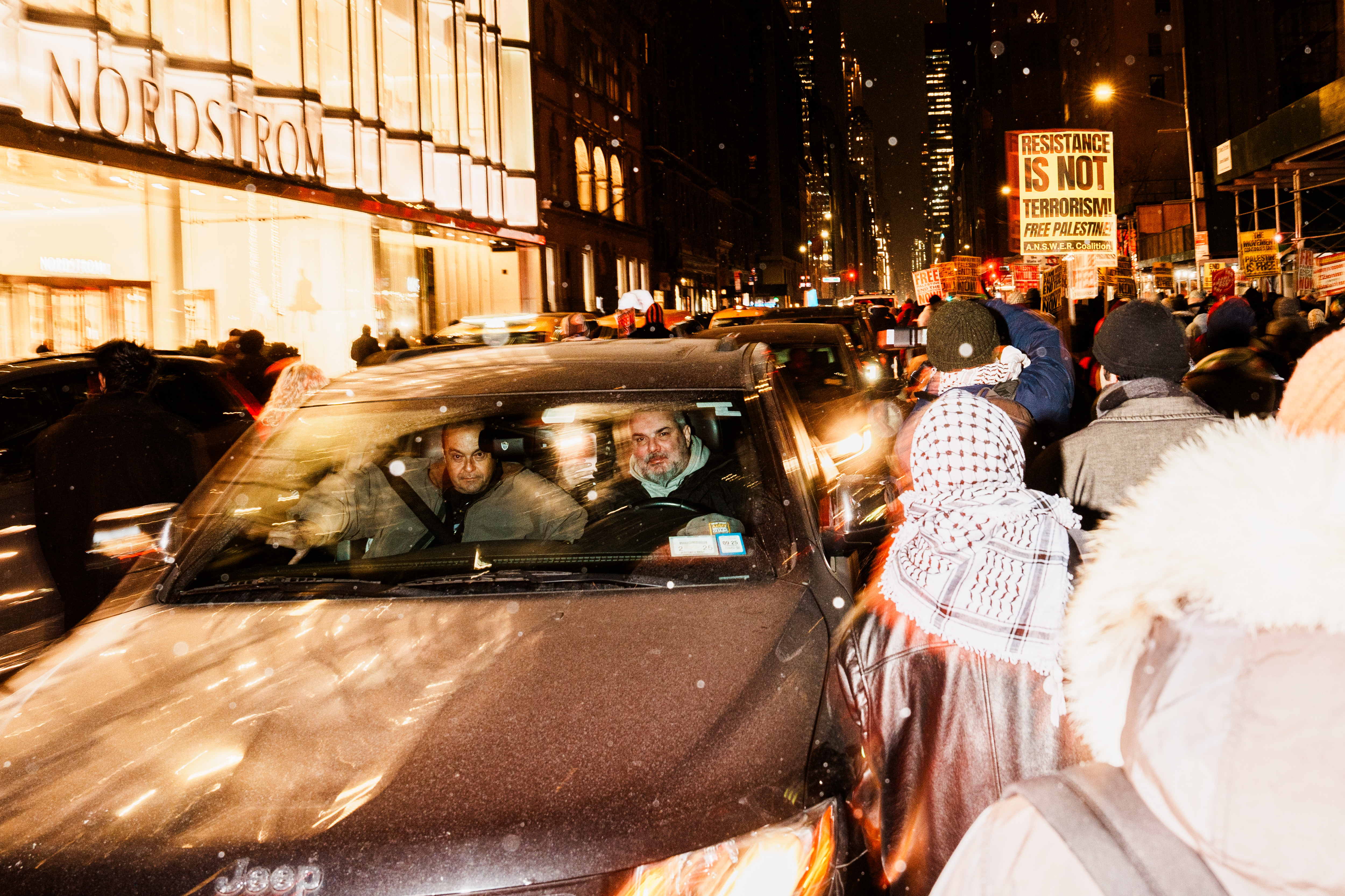 Israel and the Palestinian militant group Hamas agreed to a ceasefire in the Gaza Strip, aiming to halt hostilities and facilitate the release of hostages. In response to this development, a rally and march were held on January 16 at Times Square (West 43rd Street & Broadway) in New York City, organized by Palestinian support groups. Attendees gathered under the slogan “Ceasefire Today, Liberation Tomorrow: Gaza Will Rise,” expressing support for the ceasefire agreement and calling for the liberation of Palestine. Drivers passing by were captured with a range of expressions as they watched the demonstration unfold from their vehicles.