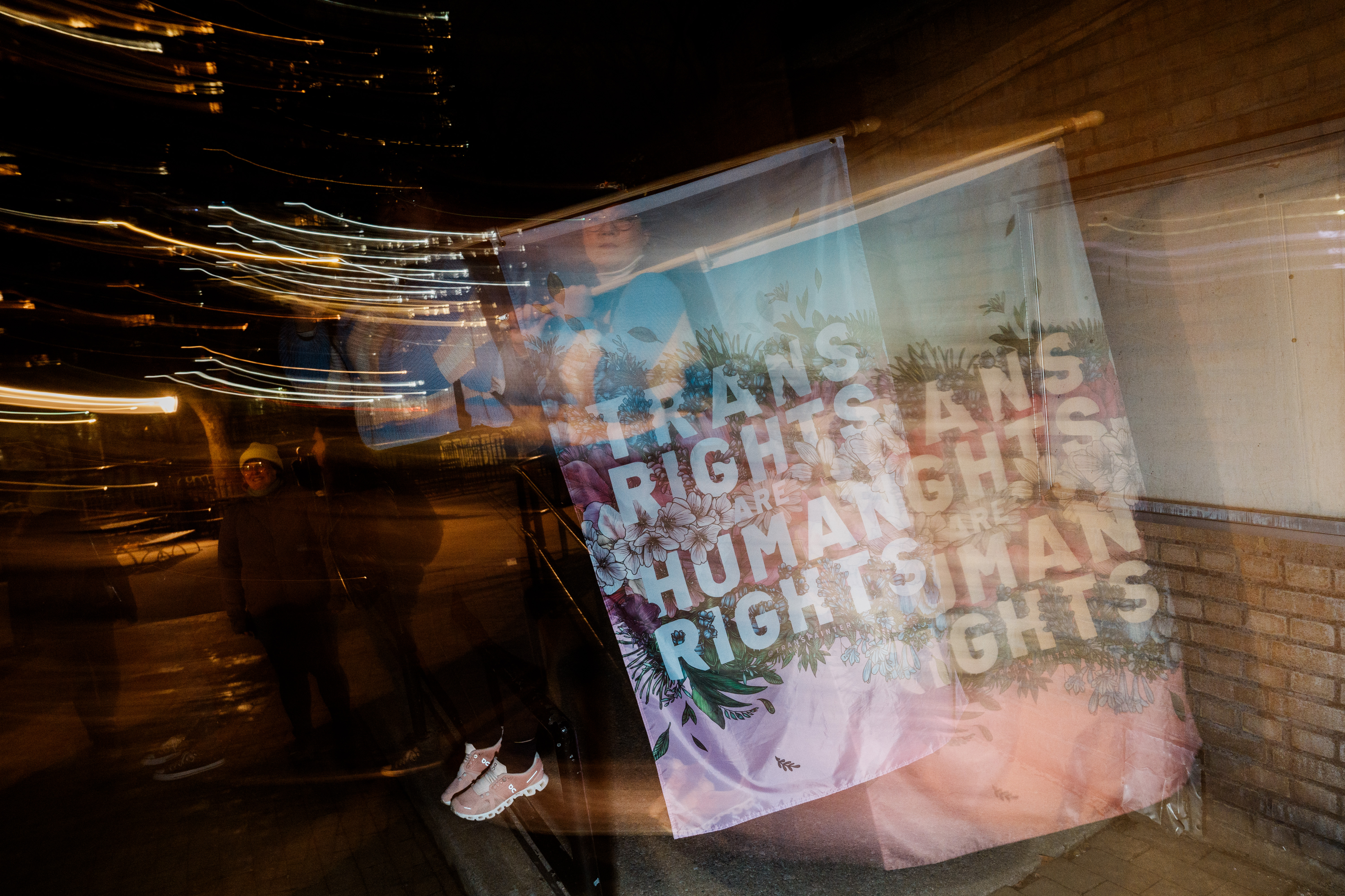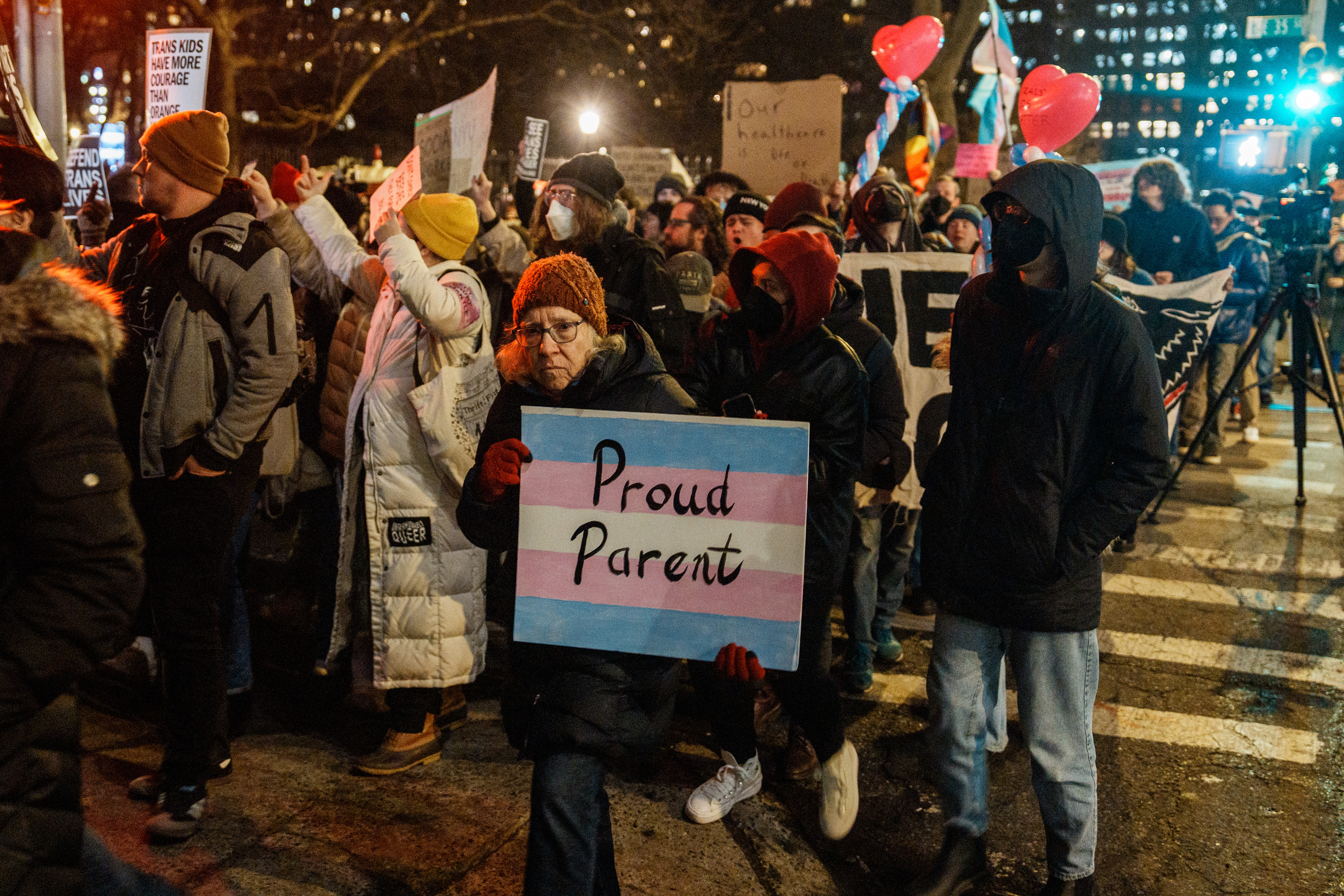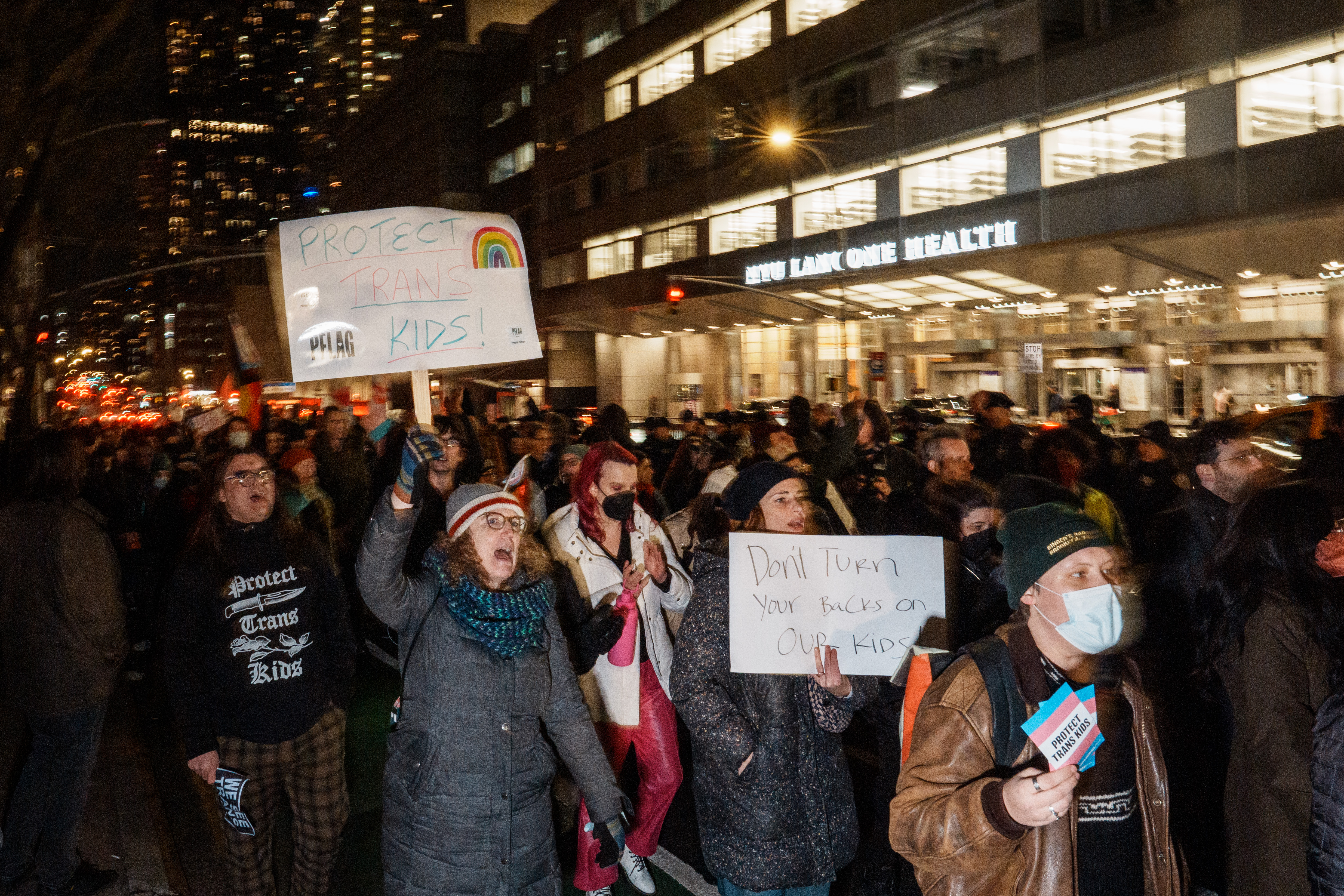 Protesters held signs and chanted slogans advocating for transgender rights and access to medical care. The executive order prohibits federal funding for gender-affirming treatments for individuals under 19, prompting hospitals, including NYU Langone, to limit related services.